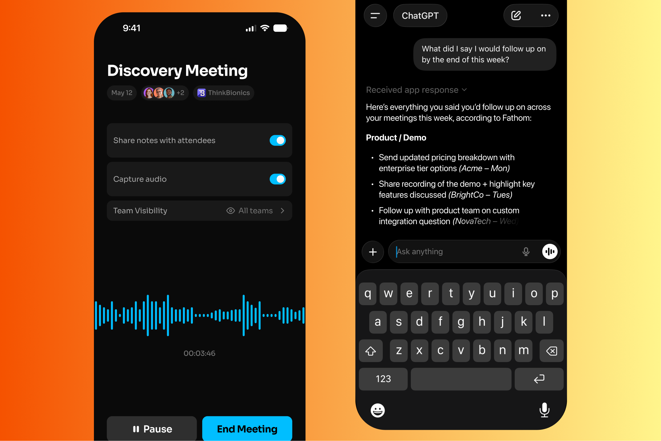 Like Granola, Fathom offers an iOS app (launching soon!) to capture meetings and conversations on the go and then connects those conversations to your workflows and tools – so insights, highlights, and next steps keep moving even when you’re away from your computer.