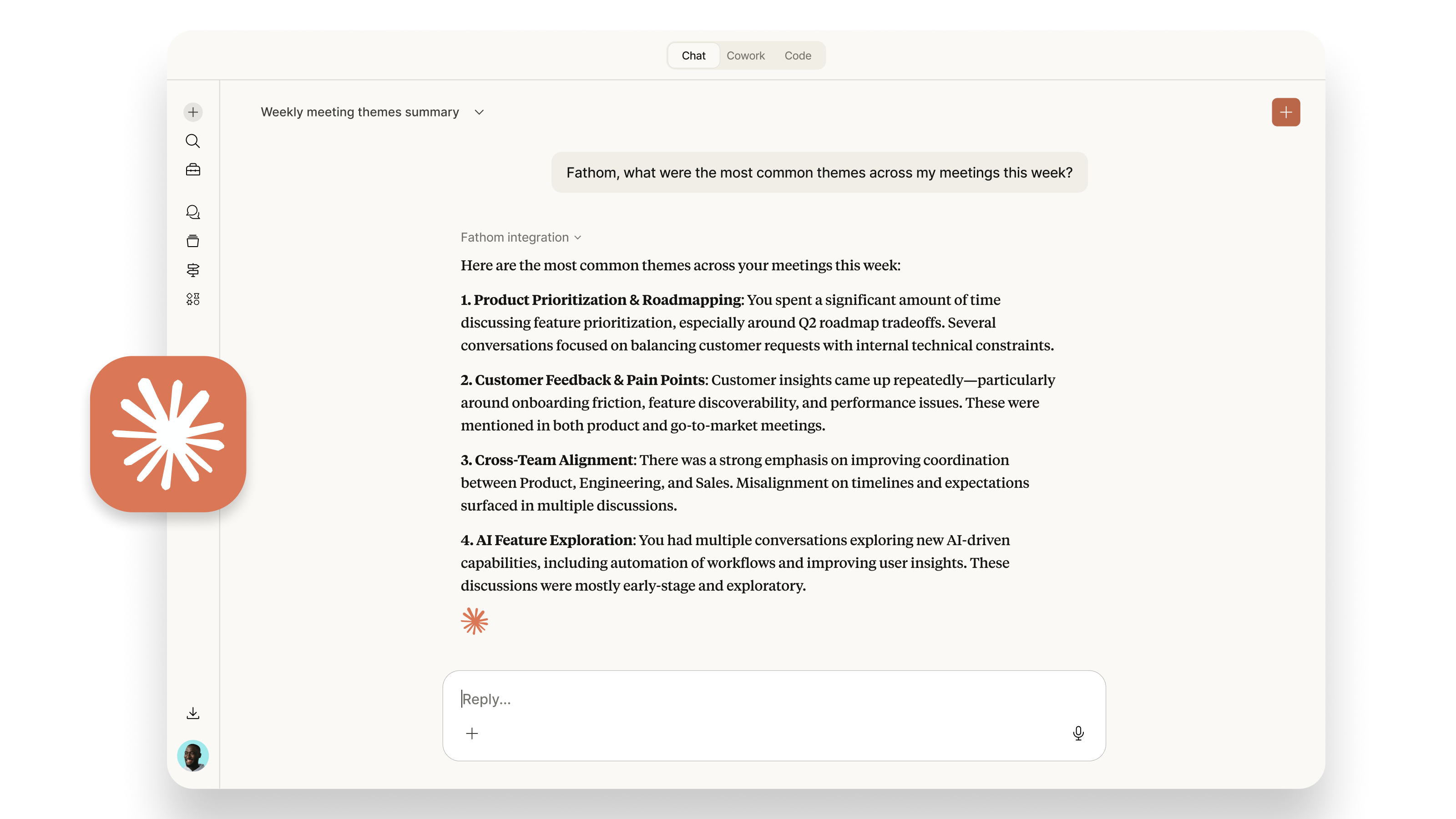 - Bring meeting context into everything you’re working on: Combine Fathom insights with your docs, emails, and plans to produce more accurate, complete work – something that’s impossible when your meeting history lives elsewhere.
