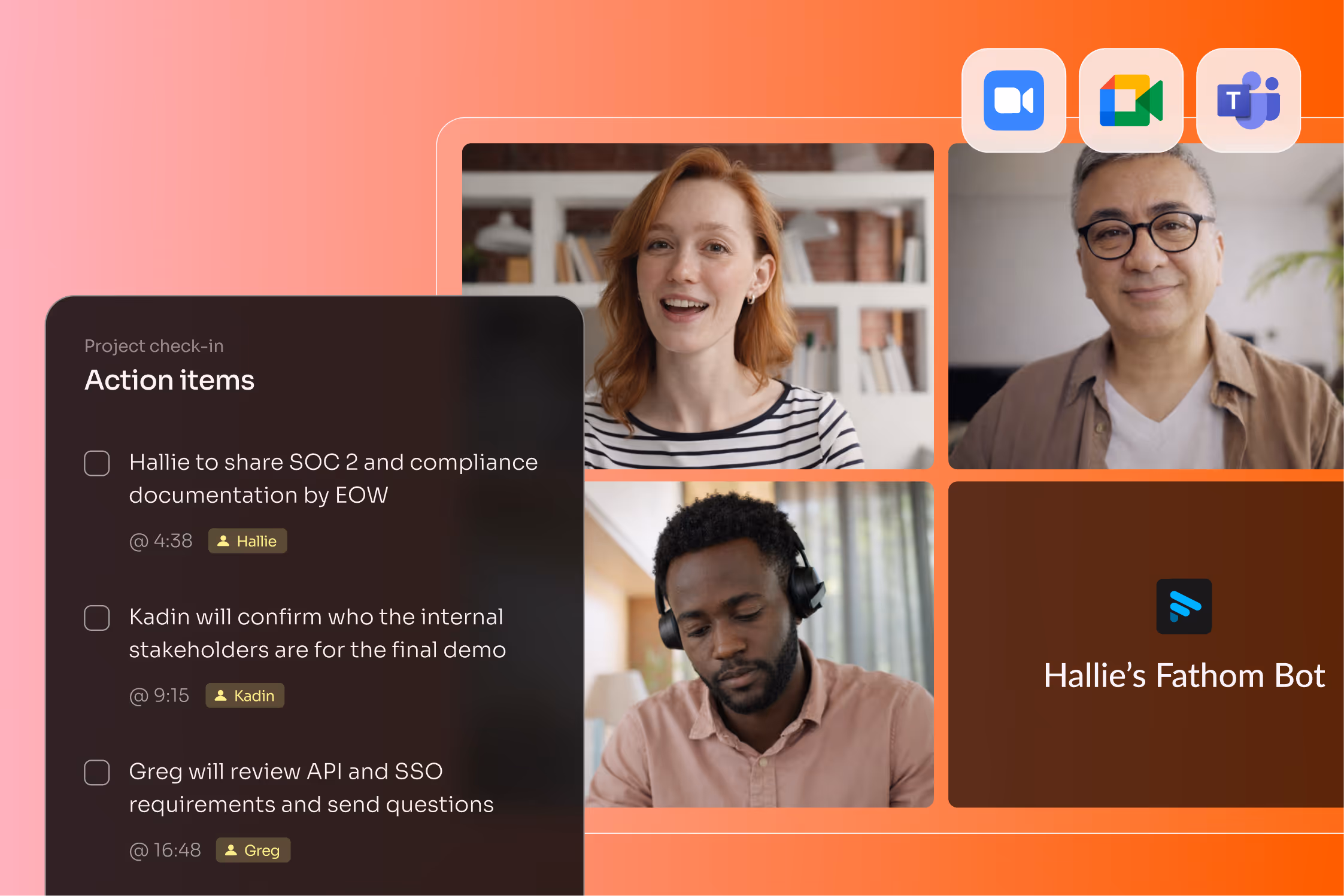 Fathom works across Zoom, Google Meet, and Microsoft Teams, automatically syncing insights into tools like Slack, Salesforce, HubSpot, Zapier, Asana, and more.